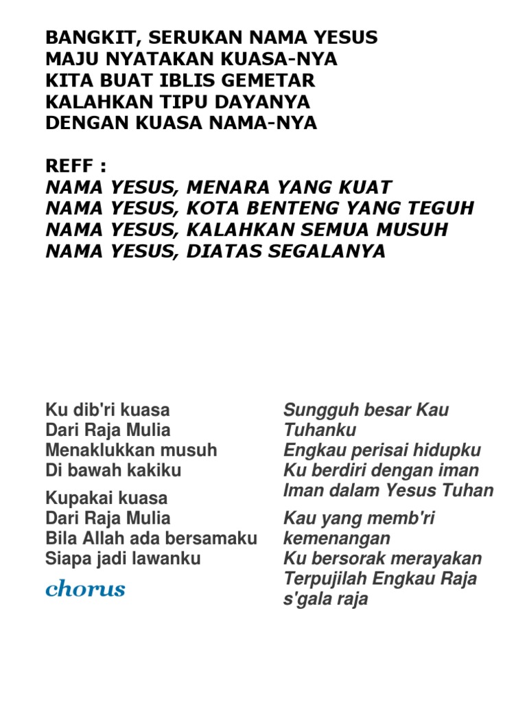 Verse Bangkit srukan nama Yesus Maju nyatakan KuasaNya Kita buat iblis gemetar Kalahkan tipu dayanya Dengan Kuasa NamaNya Chorus Nama Yesus menara yang kuat Nama Yesus Kota benteng yang teguh Nama Yesus kalahkan semua musuh Nama Yesus diatas sgalanya. Written By Admin Wednesday July 27 2022 Add Comment. Bangkit serukan nama yesus maju nyatakan kuasa-nya kita buat iblis gemetar kalahkan tipu dayanya dengan kuasa nama-nya.